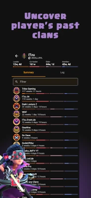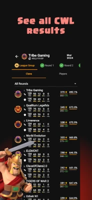 - See Player's clans history - Compete against other Players and Clans in Rankings - Search for Players by name and Town Hall level - See Clan's past members - View Clan War League results - Track Players and Clans progress - See all Clan's members at a glance - Open a Player or Clan profile directly in game