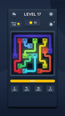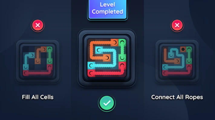 Hookup - Join Same Color Rope is a game made for users who love to play mind puzzle games. In this game, players need to connect the ropes as well as need to cover all cells. In this game, there are two categories with more than 1500 levels, First is genuine, and the second is blockers. In genuine categories there are all stages are filled with draggable cells, no blockers to avoid connection and in blockers categories, there are some blank blockers, that cause it hard to connect the ropes. Players can get hints if they are confused about the current level. Players will get 5 free hints for the first time and will get one to three hints on every 25 levels complete as a gift. Do not cut the rope for complete levle with star.