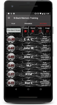 N-Back Memory Training measures your working memory accuracy using the discrimination index A' from signal detection theory (Stanislaw & Todorov, 1999). A’ generally ranges from 0.5 (random guessing) to 1.0 (perfect accuracy). A score of A' >= 0.90 advances you to the next level, and a score of A' <= 0.75 results in fallback to the previous n-back level (after one grace period). These settings can be changed in Manual Mode. For tracking your progress, A' is combined with your current n-back level so that scores range +/- 0.5 around your n-back level. For instance, on 2-back, an accuracy of A' = 1 will yield a score of 2.5, whereas A' = 0.5 will yield a score of 1.5.