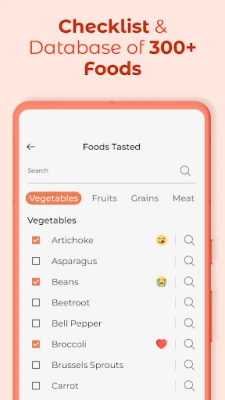 📋 Tasted Foods Tracker: Log which foods your baby has tried and note any reactions or intolerances. Keep track of favorite foods and avoid unwanted ingredients to manage food allergies in babies effectively.